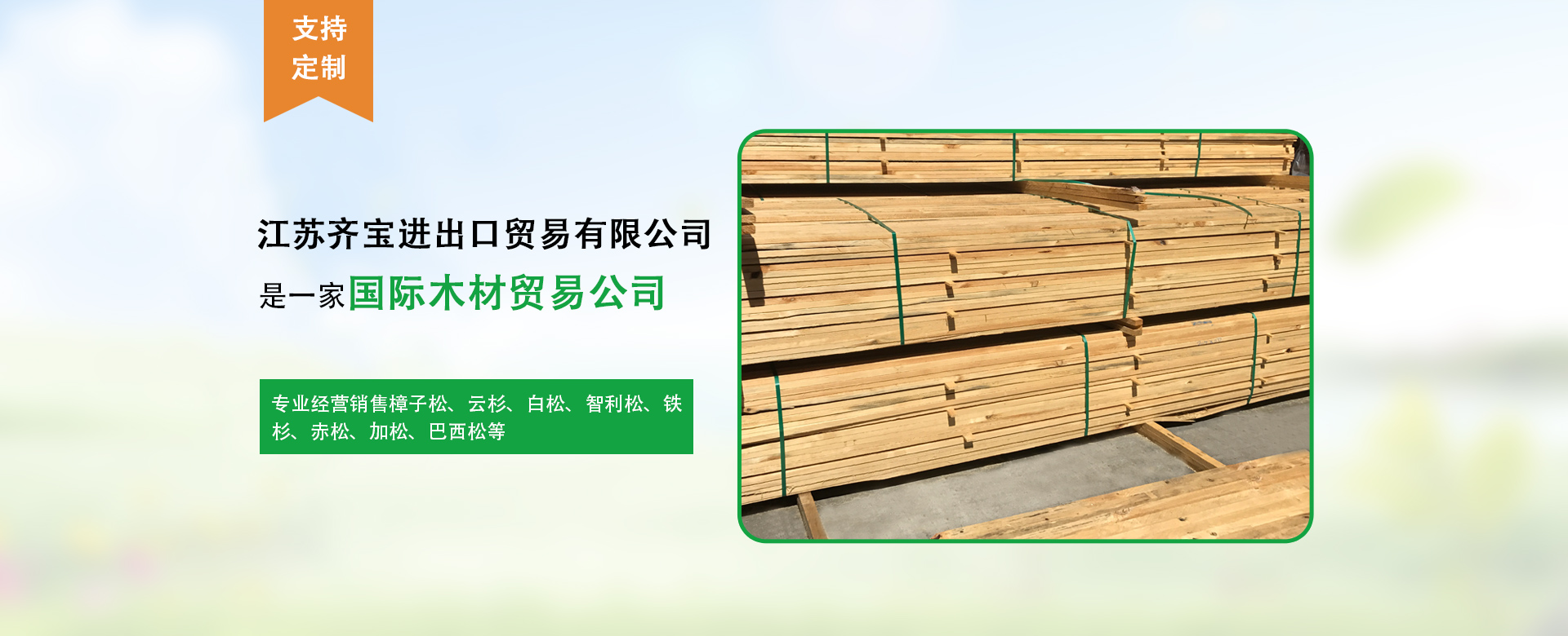 江蘇齊寶進(jìn)出口貿(mào)易有限公司是成立于2011年位于太倉港區(qū)的一家國際木材貿(mào)易公司,專業(yè)經(jīng)營銷售樟子松,云杉,白松,智利松,鐵杉,赤松,加松,巴西松等,目前我公司進(jìn)貨量約200000m3/年...